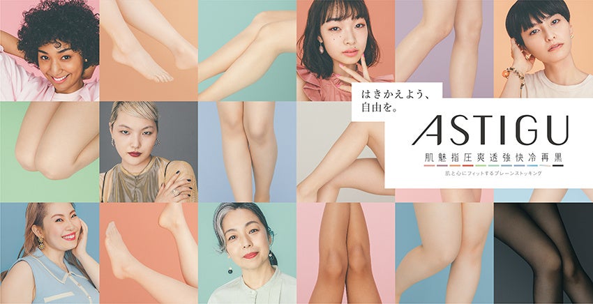 「アスティーグ」はプレーンストッキングのブランドで、女性の脚を美しく見せる多彩なラインナップを特徴としている。